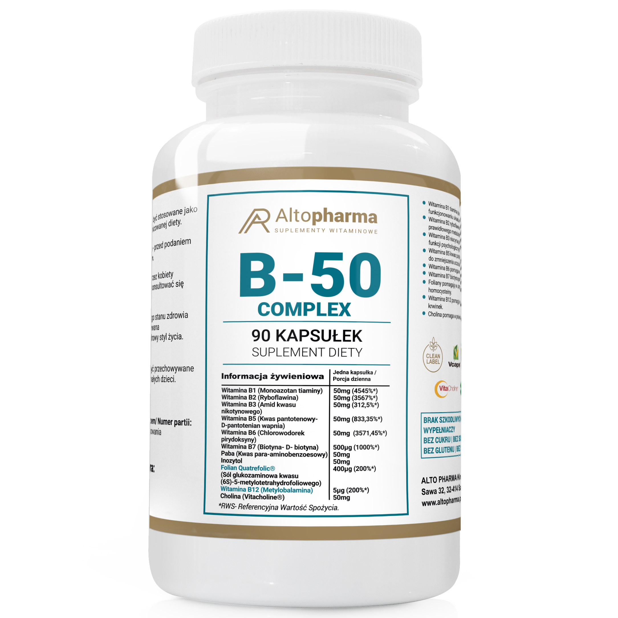 B-50 Complex marki Altopharma to suplement diety o czystym składzie, bez sztucznych dodatków, konserwantów i wypełniaczy. Kapsułki wykonano z roślinnej hypromelozy (Vcaps®), które umożliwiają kontrolowane uwalnianie składników aktywnych, nie podrażniając żołądka.