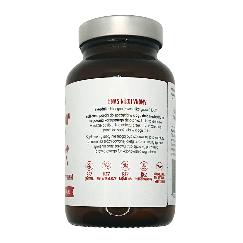 Stosowanie suplementów z niacyną, znaną również jako kwas nikotynowy, cieszy się popularnością. Witamina B3 jest rozpuszczalna w wodzie, co ułatwia jej spożywanie. Jest ceniona za liczne pozytywne właściwości, opisane są szczegółowo w informacji o produkcie, czyli: wspieranie metabolizmu energetycznego, wsparcie dla układu nerwowego, korzystny wpływ na skórę i błony śluzowe, redukcję zmęczenia oraz wsparcie dla funkcji psychologicznych!