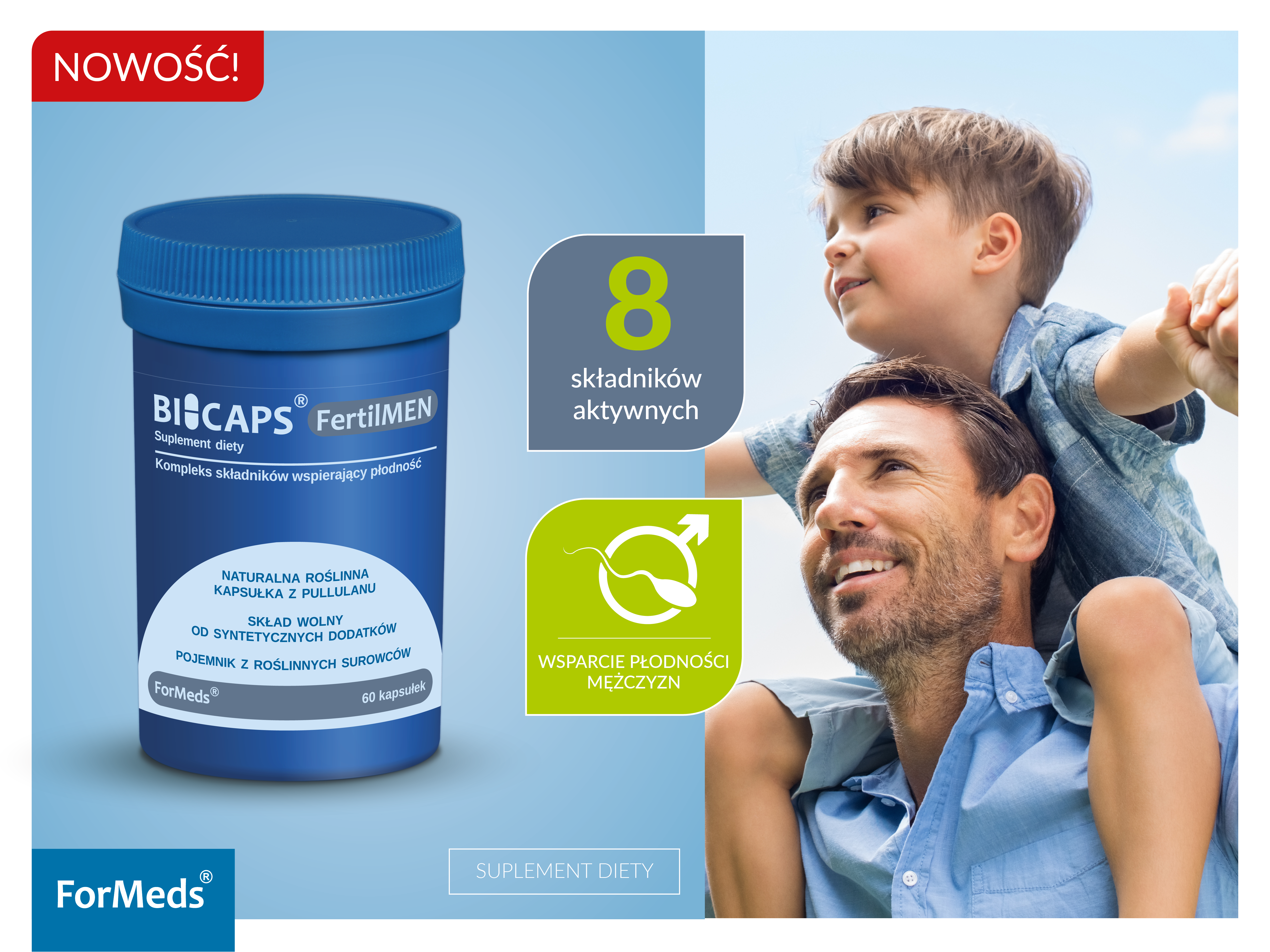 BICAPS fertilmen to przeznaczone dla mężczyzn połączenie 8 składników aktywnych w wysoko przyswajalnych dla organizmu formach. Linia BICAPS to suplementy diety bez zbędnych dodatków zamknięte w pullulanowej kapsułce roślinnej.
