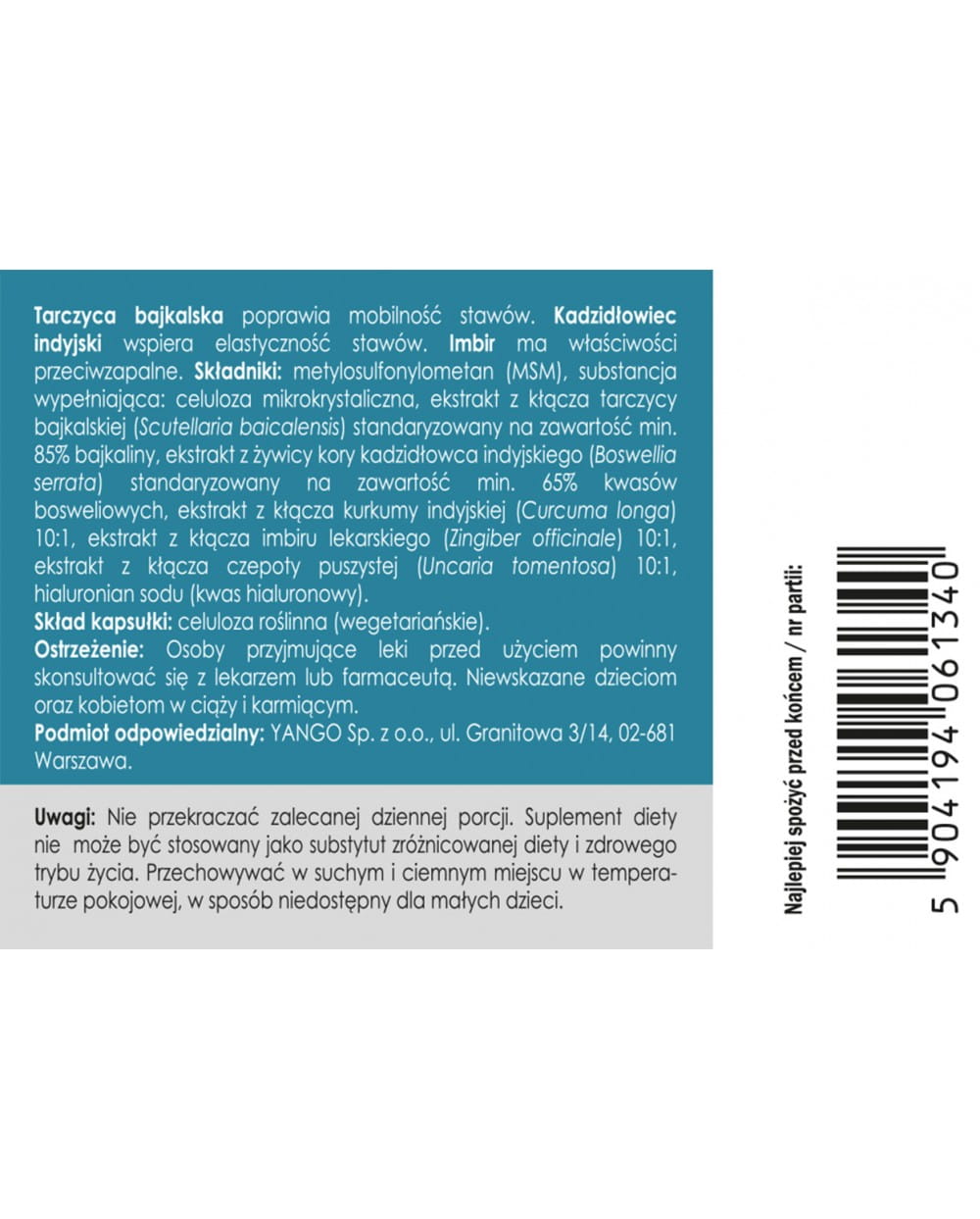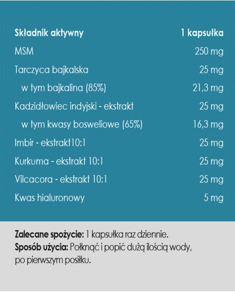 Składniki: Metylosulfonulometan, inulina, ekstrakt z kłącza tarczycy bajkalskiej (Scutellaria baicalensis) standaryzowany na zawartość min. 85% bajkaliny, ekstrakt z żywicy kory kadzidłowca indyjskiego (Boswellia serrata) standaryzowany na zawartość min. 65% kwasów bosweliowych, ekstrakt z kłącza kurkumy indyjskiej (Curcuma longa) 10:1, ekstrakt z kłącza imbiru lekarskiego (Zingiber officinale) 10:1, ekstrakt z kłącza czepoty puszystej (Uncaria tomentosa) 10:1, niskocząsteczkowy hialuronian sodu (kwas hialuronowy) Skład kapsułki: celuloza roślinna