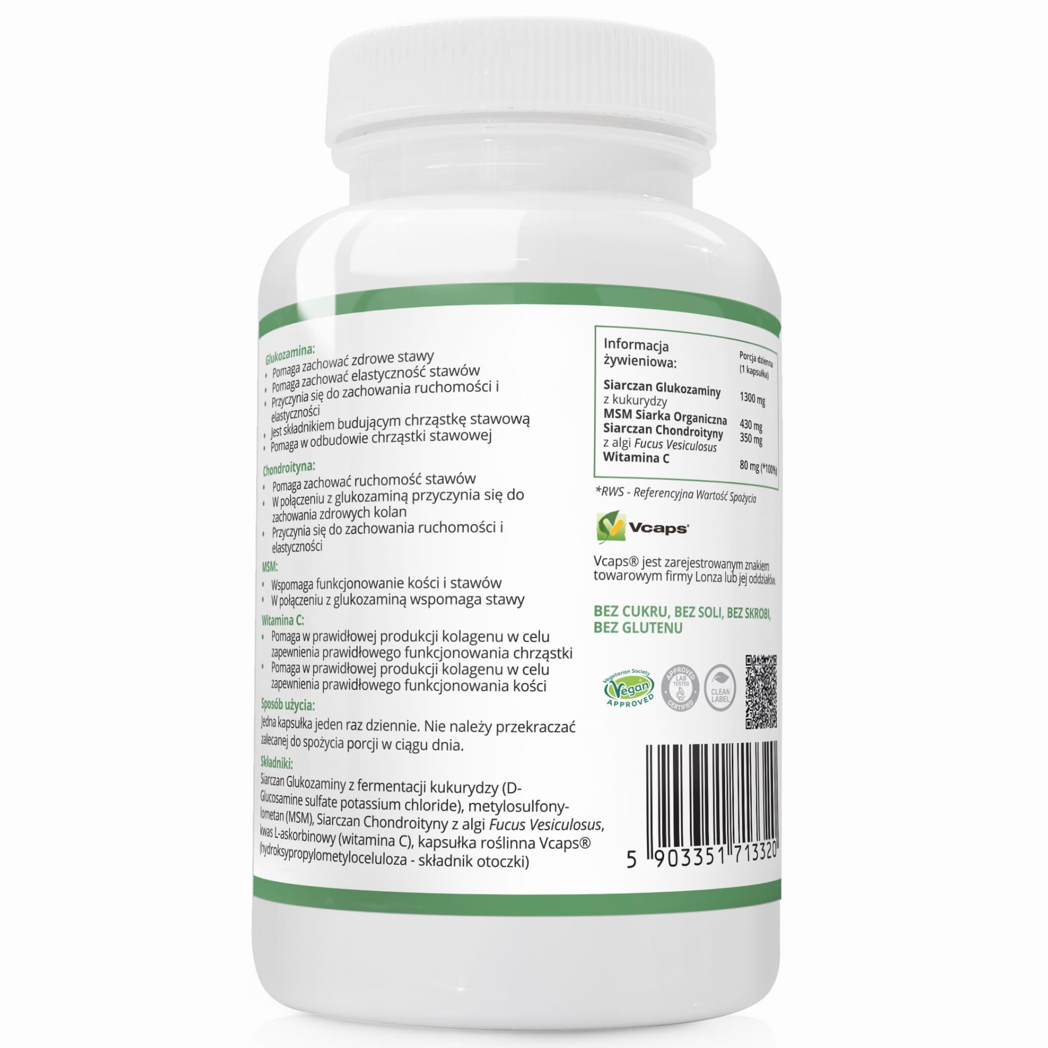 | Składniki: Siarczan glukozaminy z fermentacji kukurydzy (D-Glucosamine sulfate potassium chloride), metylosulfonylometan (MSM), Siarczan chondroityny z algi Fucus Vesiculosus, kwas L-askorbinowy (witamina C), kapsułka roślinna Vcaps® (hydroksypropylometyloceluloza – składnik otoczki) | ||