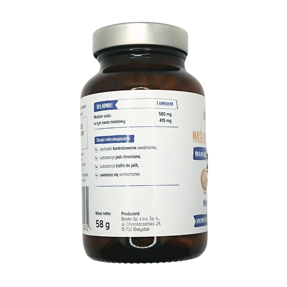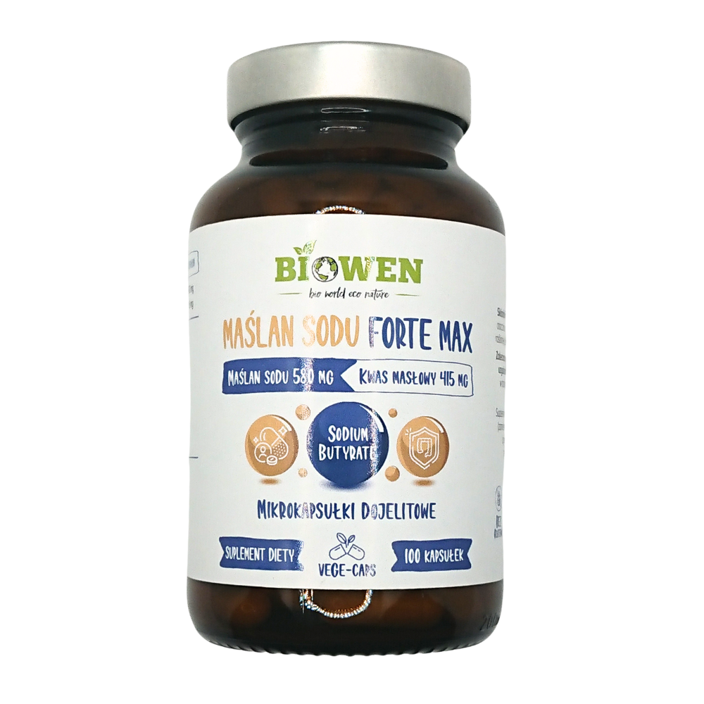 W każdej kapsułce Maślanu sodu Biowen znajduje się imponująca ilość – aż 580 mg – tej substancji, czyli maślanu sodu. Co więcej, aż 415 mg stanowi kwas masłowy, który jest naturalnie obecny w organizmie człowieka. Aby zapewnić skuteczne dotarcie tego składnika do jelit – miejsca, w którym jest najbardziej potrzebny – zastosowaliśmy innowacyjną mikrokapsułkę dojelitową. Dzięki tej zaawansowanej technologii, maślan sodu może bezpiecznie pokonać drogę przez układ pokarmowy.