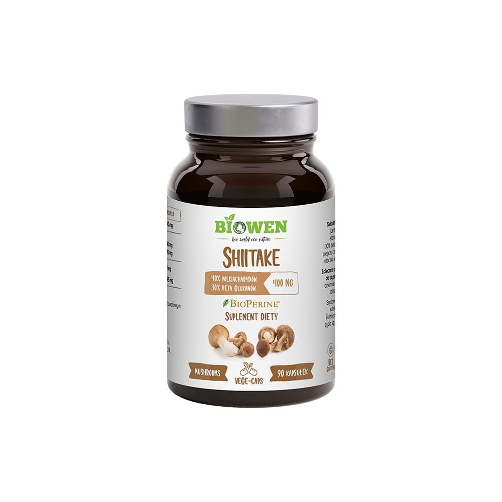 Kapsułki z ekstraktem z Shiitake marki Biowen są wysokiej jakości, a świadczy o tym wysoka standaryzacja produktu aż na 30% beta-glukanów! Jest to ważne, bo to właśnie one są najważniejszymi polisacharydami w grzybach witalnych. Producenci wskazujący na wysoką ilość polisacharydów w swoich produktach powinni podać standaryzację, ponieważ bez tej informacji nie mamy gwarancji, że suplement z Shiitake będzie wartościowy.