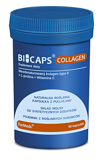 BICAPS Collagen marki ForMeds to suplement diety łączący kolagen typu II, aminokwas L-prolinę oraz witaminę C w kapsułkach roślinnych wykonanych z pullulanu. Produkt należy do linii BICAPS – suplementów o prostym, przejrzystym składzie, bez zbędnych dodatków, konserwantów i sztucznych barwników.