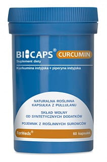 BICAPS Curcumin to suplement diety marki ForMeds, zawierający standaryzowany ekstrakt z kurkumy indyjskiej oraz ekstrakt z czarnego pieprzu indyjskiego. Składniki zostały starannie dobrane i standaryzowane na zawartość kurkuminoidów i piperyny. Produkt należy do linii BICAPS – kapsułki roślinne z pullulanu, bez zbędnych dodatków technologicznych i barwników.