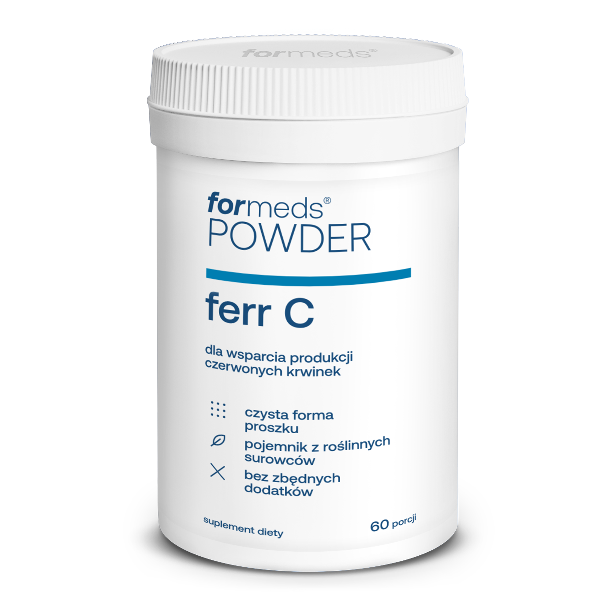 POWDER ferr C zawiera żelazo w wysoko przyswajalnej formie (fumaran żelaza (II)) w połączeniu ze sproszkowanym sokiem z korzenia buraka oraz witaminą C. Linia POWDER to suplementy diety w czystej formie proszku bez zbędnych dodatków.