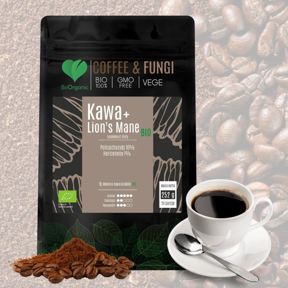 BeOrganic Coffee & Fungi to aromatyczna kawa dla osób, które cenią nie tylko smak, ale i jakość. To unikalne połączenie ekologicznej, mielonej kawy Arabica z dodatkiem standaryzowanego ekstraktu z soplówki jeżowatej (Lion’s Mane) – grzyba znanego w tradycyjnej medycynie azjatyckiej ze swoich właściwości wspierających układ nerwowy i funkcje poznawcze.