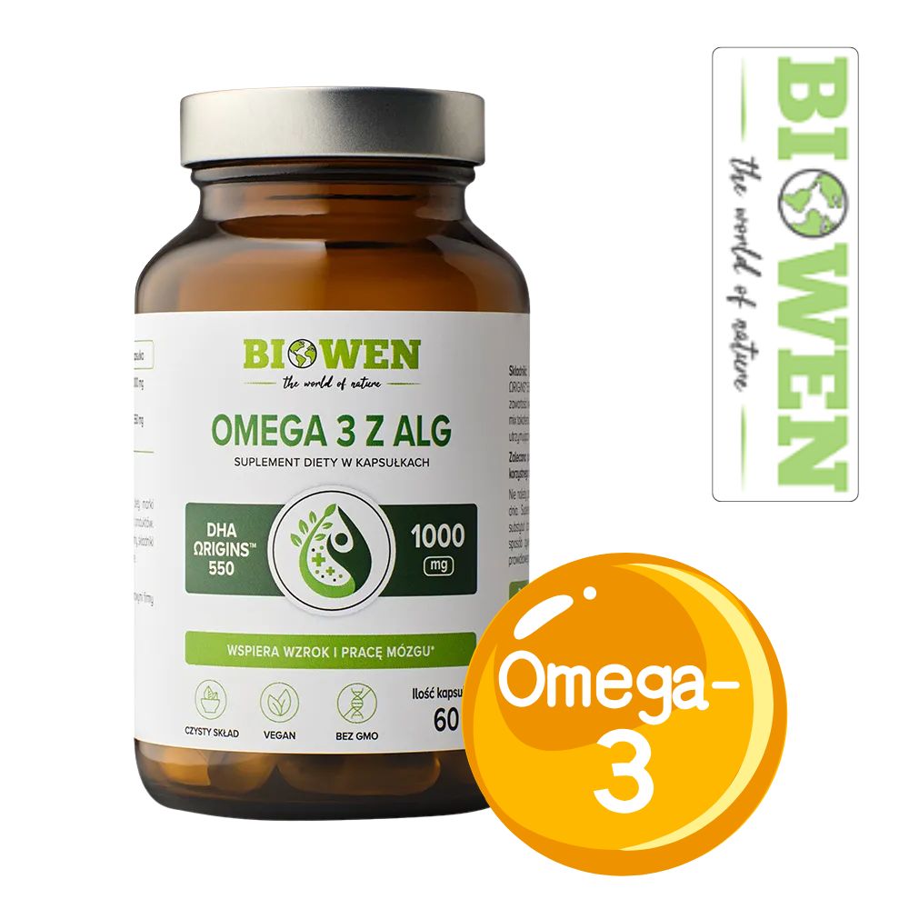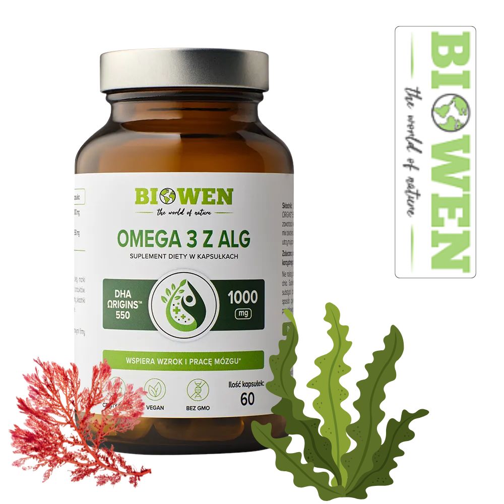 Omega-3 z alg Biowen to wysokiej jakości suplement diety w kapsułkach, zawierający czysty kwas dokozaheksaenowy (DHA) pozyskiwany z mikroalg Schizochytrium sp. od renomowanego producenta Fermentalg®. Jest to roślinne źródło DHA, stanowiące bezpieczną i skuteczną alternatywę dla tradycyjnych olejów rybich.